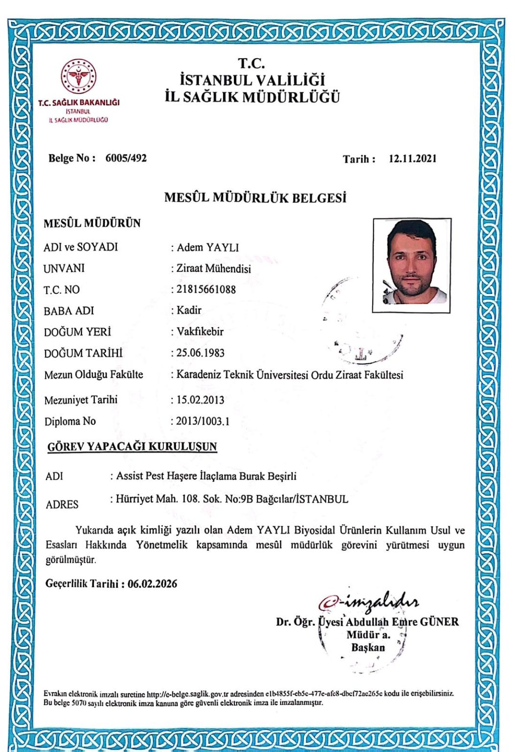 Tarım Bakanlığı lisanslı teknisyenlerimiz ve tam kapsamlı sigortamızla güvence altındasınız.